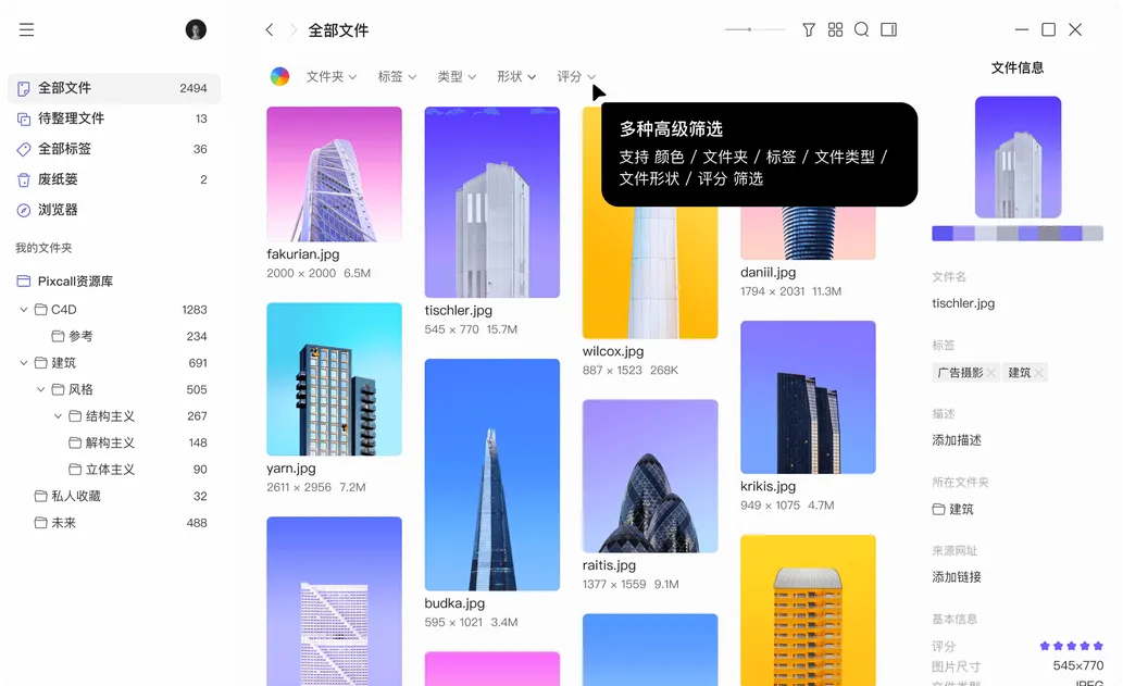 文件描述、来源、评分帮助您标记文件,并且可通过搜索和筛选快速找到对应文件