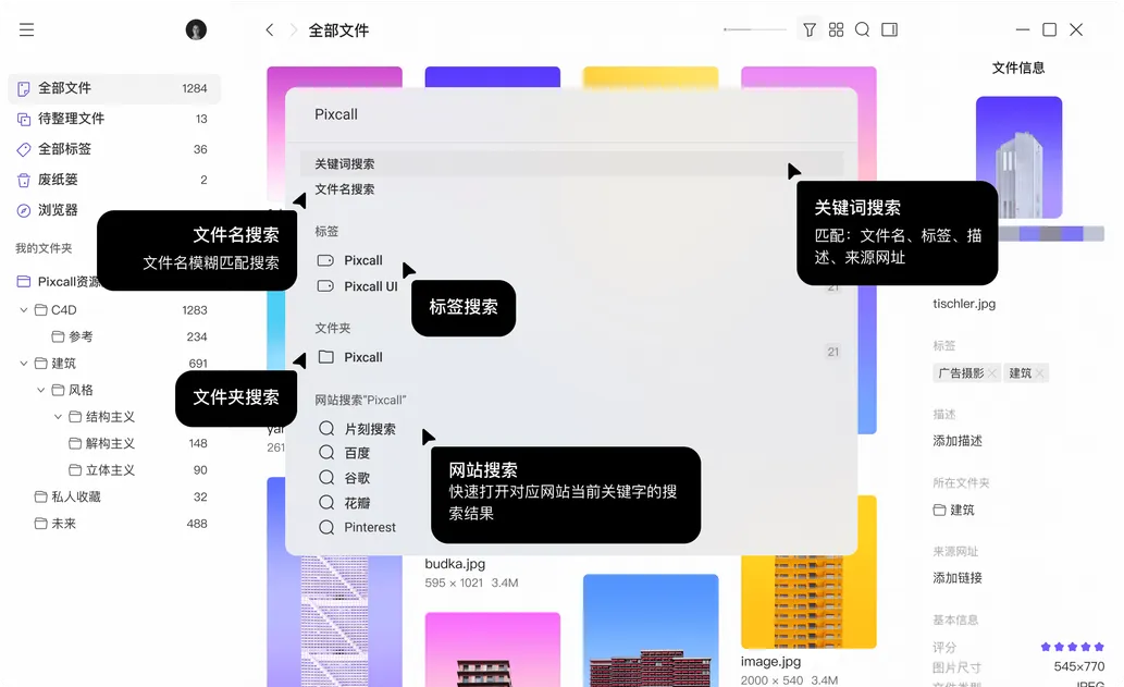 Pixcall 不仅仅是一个自带云同步的素材管理工具,内置的素材搜索功能也非常强大,能一键查看主流素材和字体网站的指定资源。这是一款从素材获取、管理、使用的全链路工具。